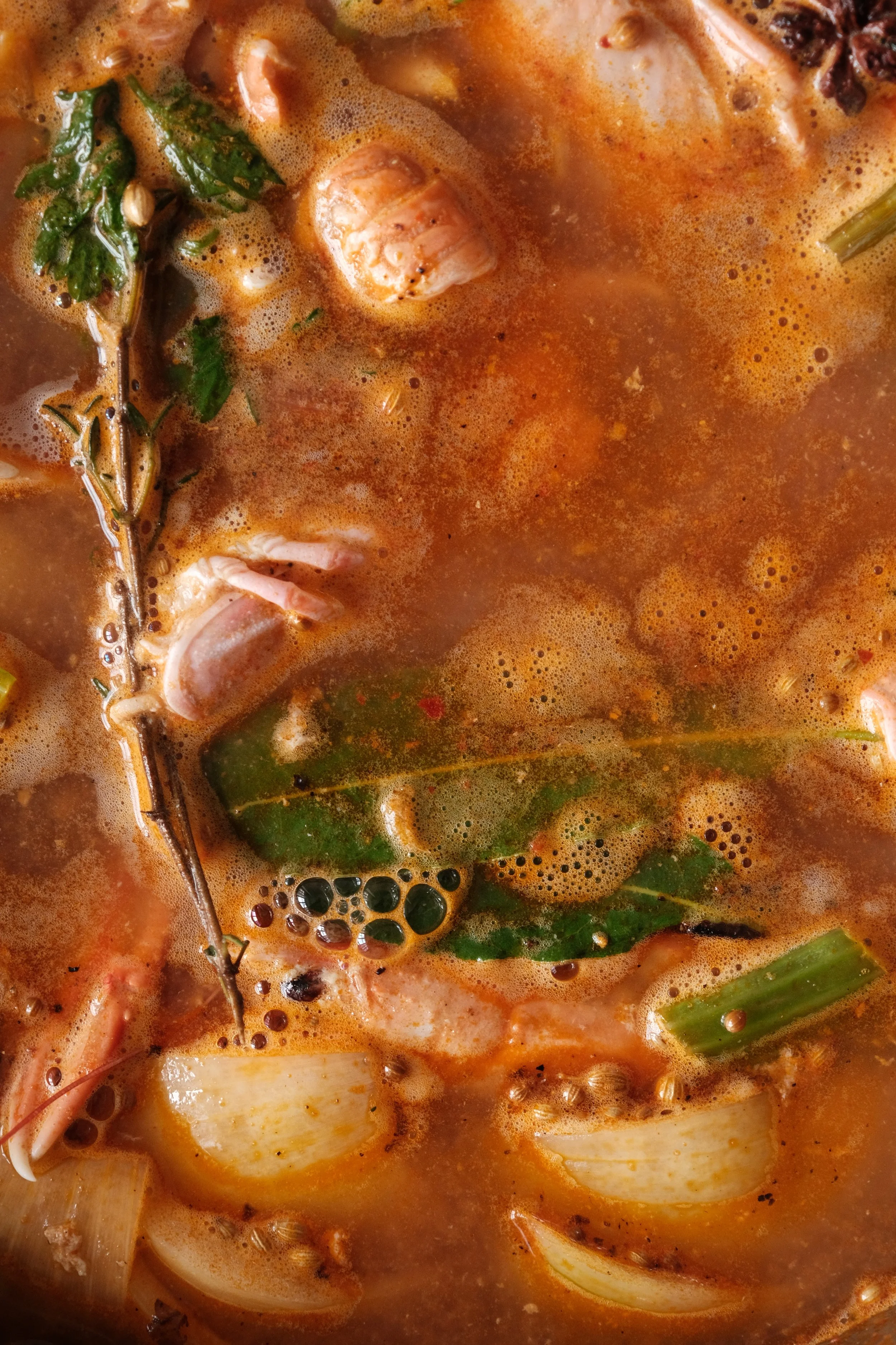 4. Mouiller à hauteur, ajouter 2 feuilles de laurier, quelques branches de persil, le zeste de citron, la coriandre et le fenouil. Saler, poivrer. Mélanger. Porter à ébullition, puis baisser le feu et laisser mijoter à feu moyen pendant au moins 1h.