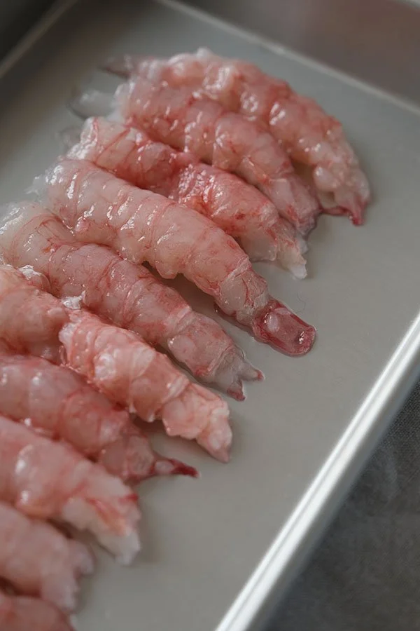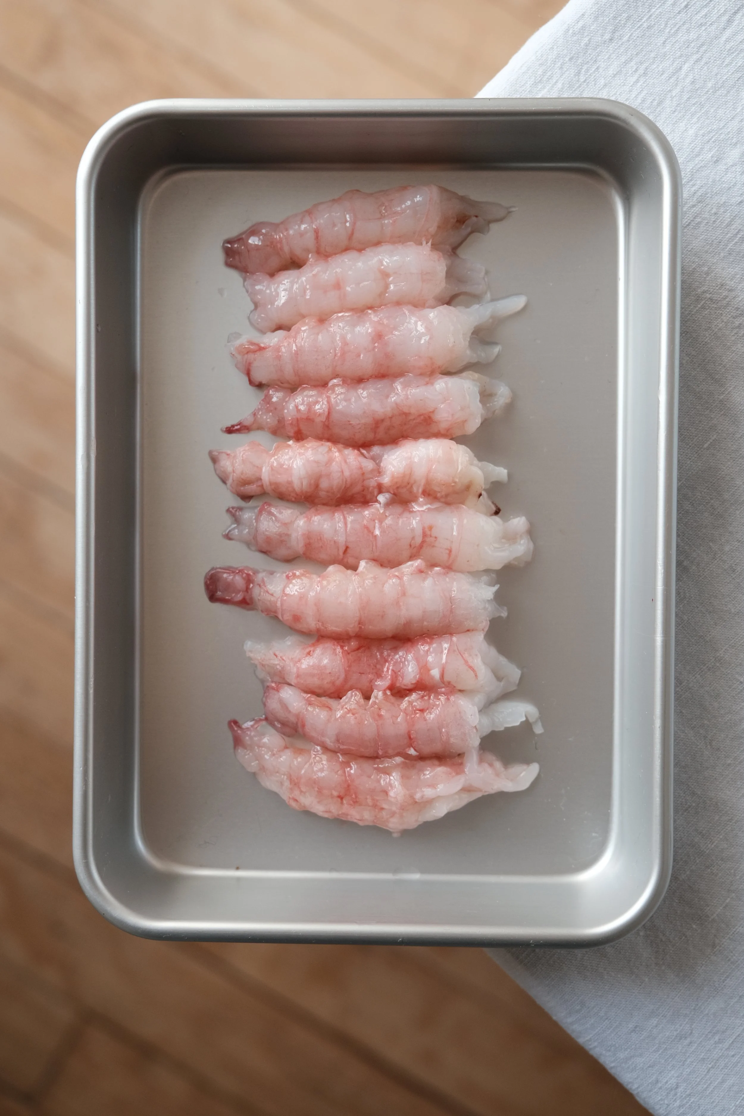 1. Retirer les têtes de langoustines et réserver pour la bisque. Retirer ensuite la chair de chaque langoustine en pressant la carapace entre vos doigts. Ajouter les carapaces aux têtes de langoustines et réserver la chair au frais pour le service.